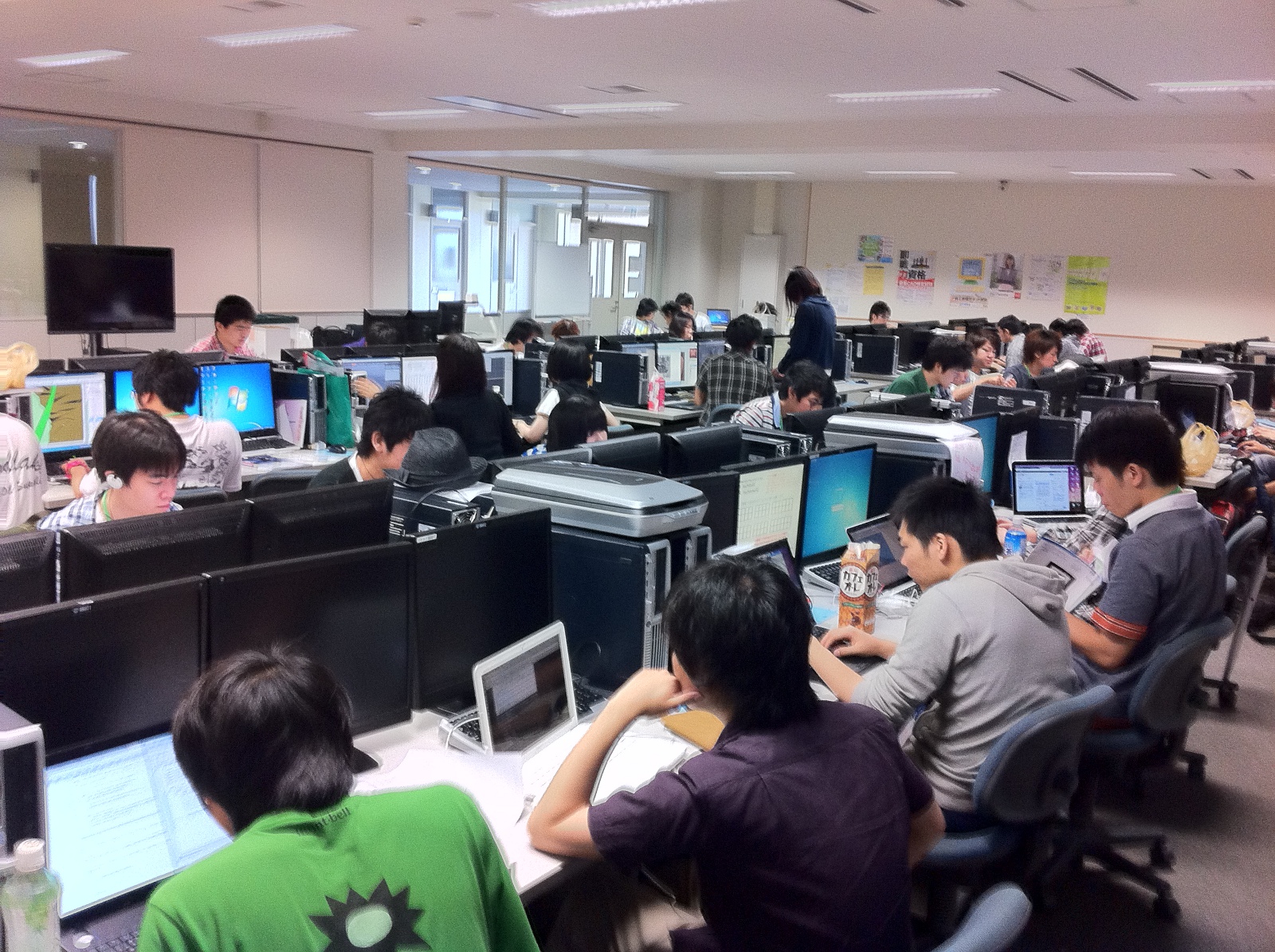 毎月、福岡工業大学短期大学部の弘中研究室で実施されているイベントです。基本的には本学学生のスキルアップのためにゲーム、CG、映像などのデジタルでの作品制作を行っていますが、積極的に外部の方々の参加を受け入れています。現在、周辺の大学や専門学校の学生さん、教員、プロの方々の参加があります。